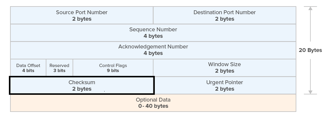 TCP 세그먼트에 포함되는 프로토콜 헤더와 데이터 모두에 대한 변형 오류를 검출하기 위해 사용한다. IP 프로토콜에서 사용하는 오류 검출 알고리즘을 사용한다.