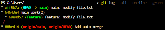 # => 공통 조상 + main + feature 비교 → 3-way merge 발생