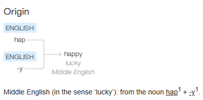 - 원형 : 'hap'(=luck) + '-y' ("행운이 넘치는")