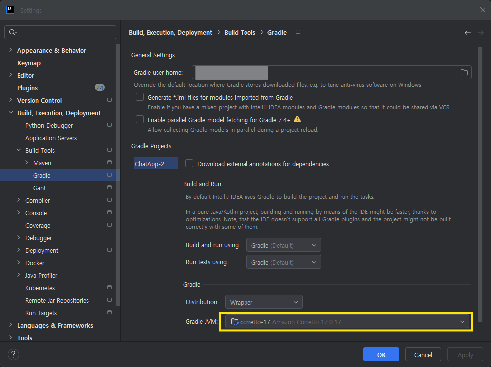 - File → Settings → Build Tools → Gradle → Gradle JVM: Corretto 17