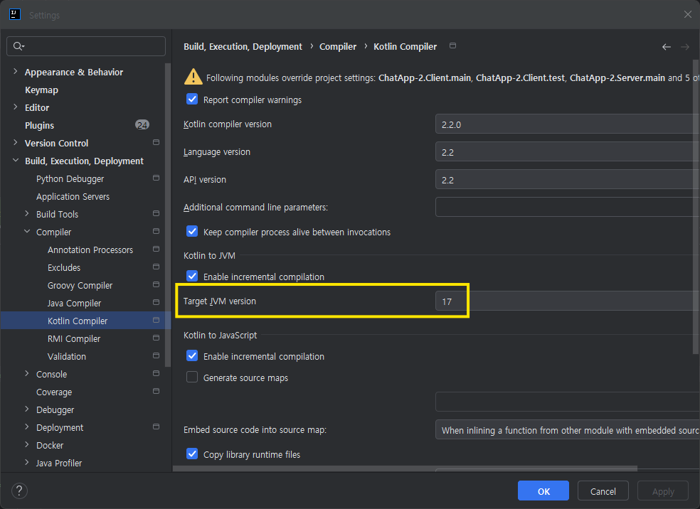 - File → Settings → Kotlin Compiler → Target JVM version: 17