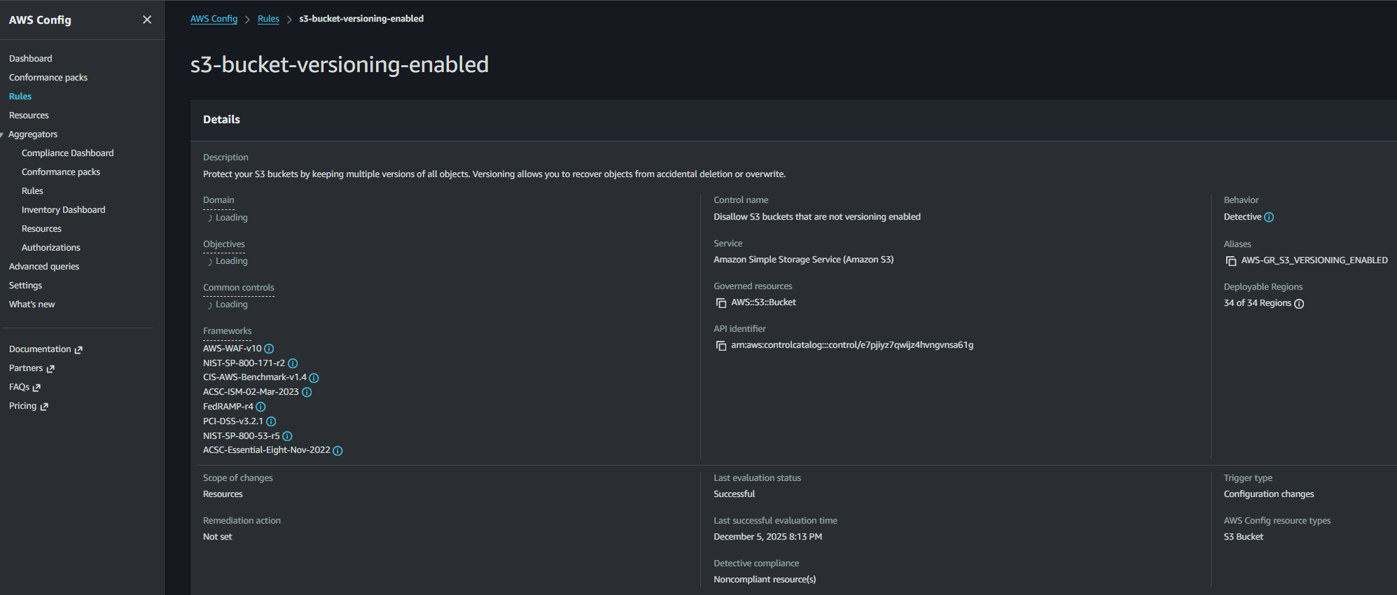 - 아래 시나리오는 `s3-bucket-versioning-enabled` AWS managed rule을 활성화했다.