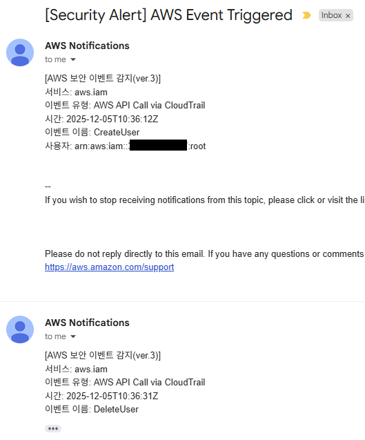 IAM 사용자 생성/삭제, 정책 부착 등 고위험 이벤트가 EventBridge → Lambda → SNS로 정상 전달되는지 확인한다.