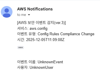 AWS Config Rule의 평가 결과가 "NON_COMPLIANT"일 때 EventBridge → Lambda → SNS까지 정상 흐름을 검증한다.