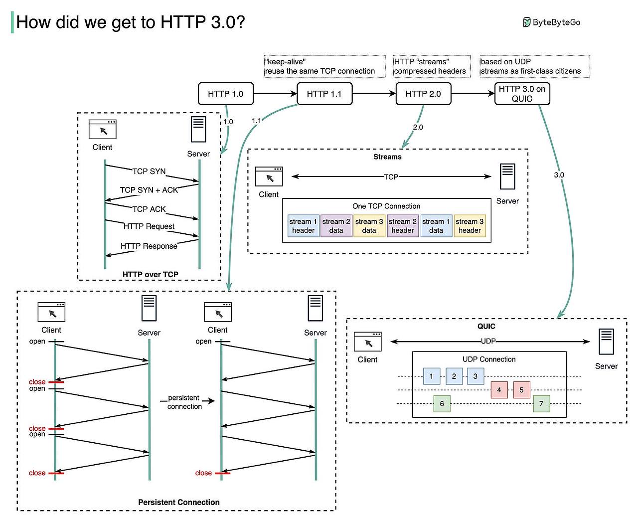 - HTTP 1.0 -> HTTP 1.1 -> HTTP 2.0 -> HTTP 3.0 (QUIC)