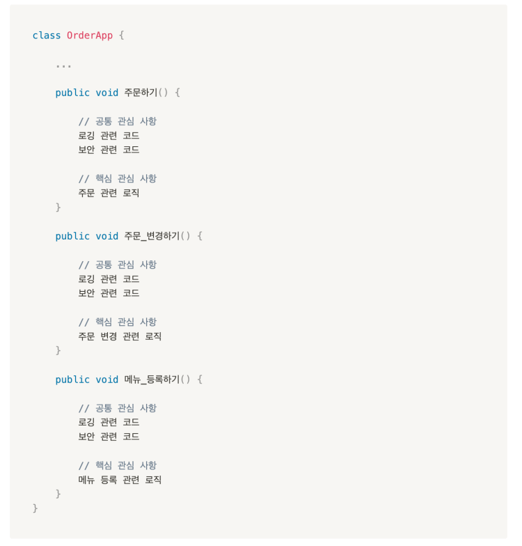 이처럼 애플리케이션 전반에 걸쳐 적용되는 공통 기능을 비즈니스 로직에서 분리해내는 것이 AOP(관심 지향 프로그래밍)다.